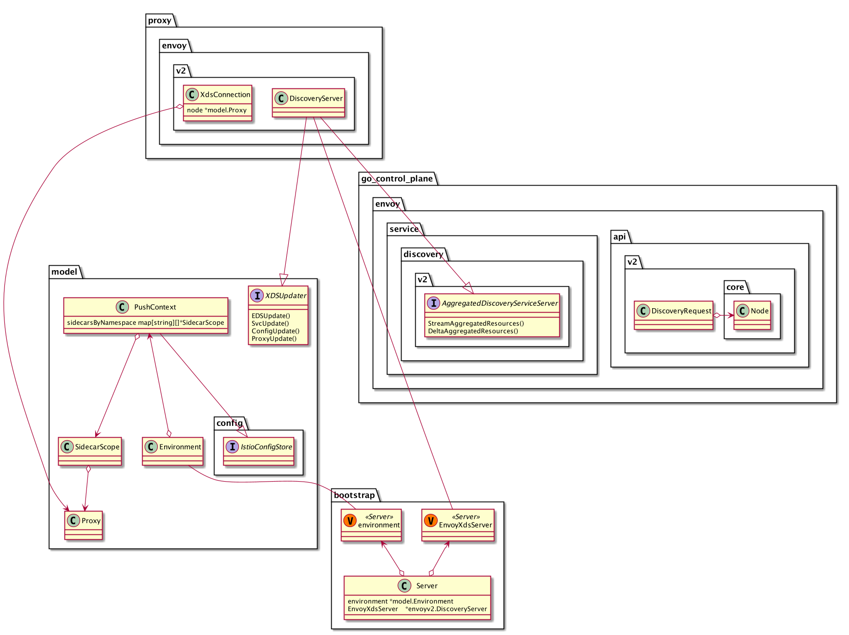 可以看出server和DiscoveryServer都包含了同一个Environment对象,这个Environment对象内部有一个PushContext对象,它在创建Environment对象的内部进行创建,这个PushContext对象在server和envoy交互时起着举足轻重的作用,通过它可以获取所有配置信息,包括kube svc、istio crd等,向envoy推送的各种配置就是通过PushContext来获取并生成的。